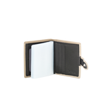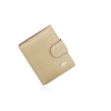 Stylish grey genuine leather wallet with secure snap closure. Features multiple card slots, a removable card holder insert, and a two-tone interior for added elegance.