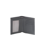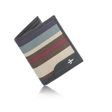A stylish tri-fold wallet that combines grey genuine leather trim with a multicolor striped woven fabric exterior. Inside, the matching grey leather interior offers 3 card slots, 2 slip pockets, 1 ID window, and a full-length bill compartment — keeping your essentials neatly organized. |